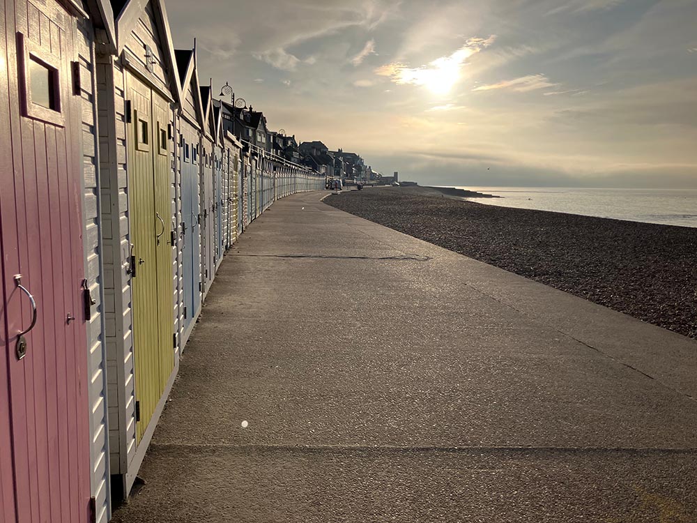 Beach hut number 23 Sea View, features a pastel yellow door with uninterrupted views across the main beach to The Cobb harbour. The hut has 4 chairs, 2 deckchairs, a sun parasol and small coffee table for your perfect day at the beach.