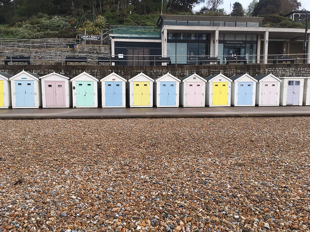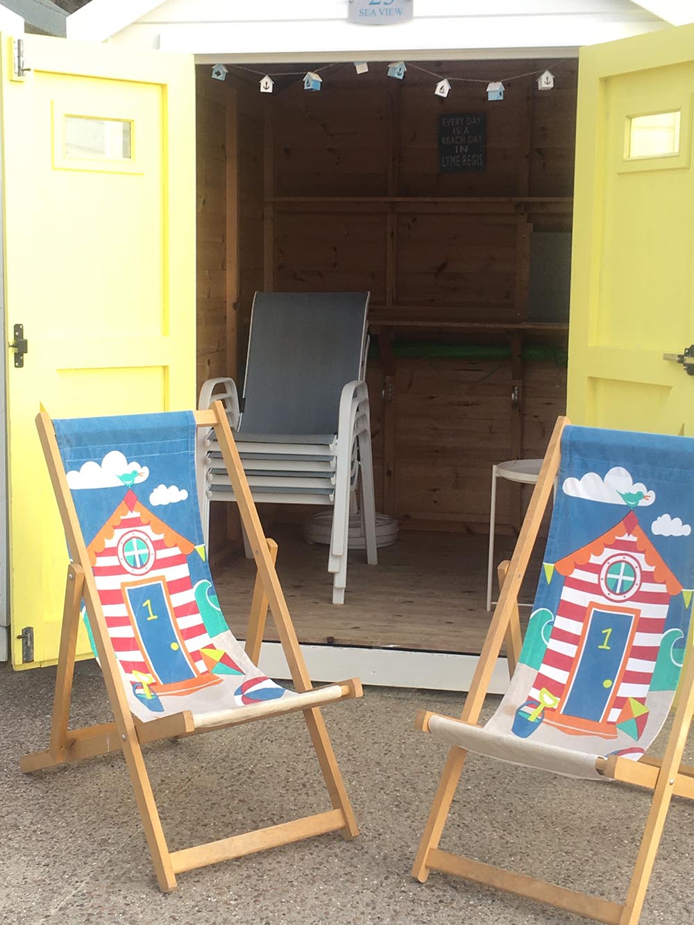 Beach hut number 23 Sea View, features a pastel yellow door with uninterrupted views across the main beach to The Cobb harbour. The hut has 4 chairs, 2 deckchairs, a sun parasol and small coffee table for your perfect day at the beach.